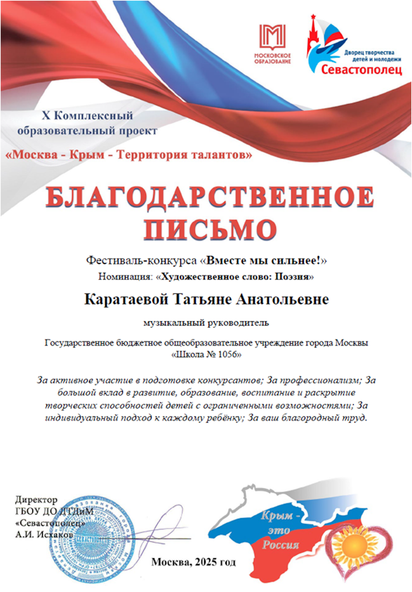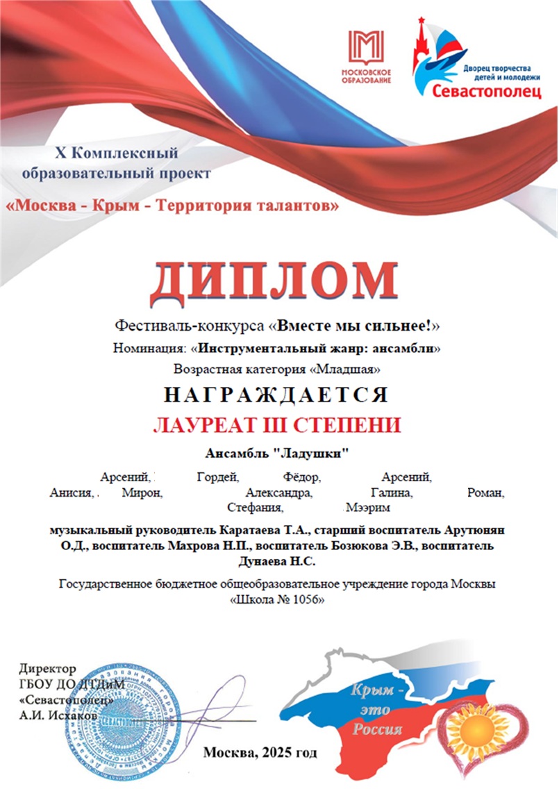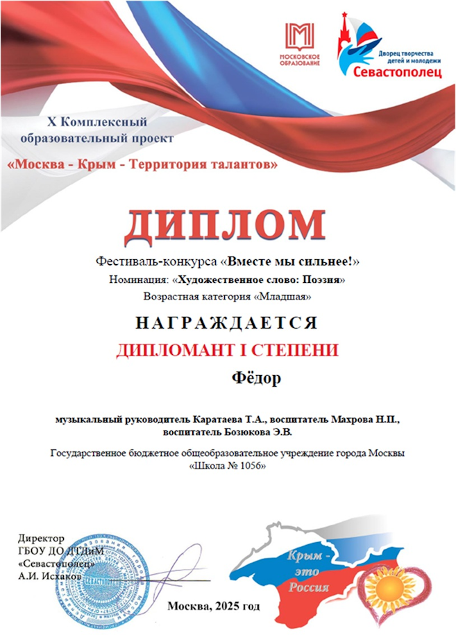 Воспитанник ДО 1 Фёдор стал дипломантом I степени в номинации "Художественное слово: Поэзия", вокальные ансамбли «Ладушки» ДО 3 и «Верные друзья» ДО 5 стали лауреатами городского конкурса «Вместе мы сильнее». Руководители - О.Д. Арутюнян,